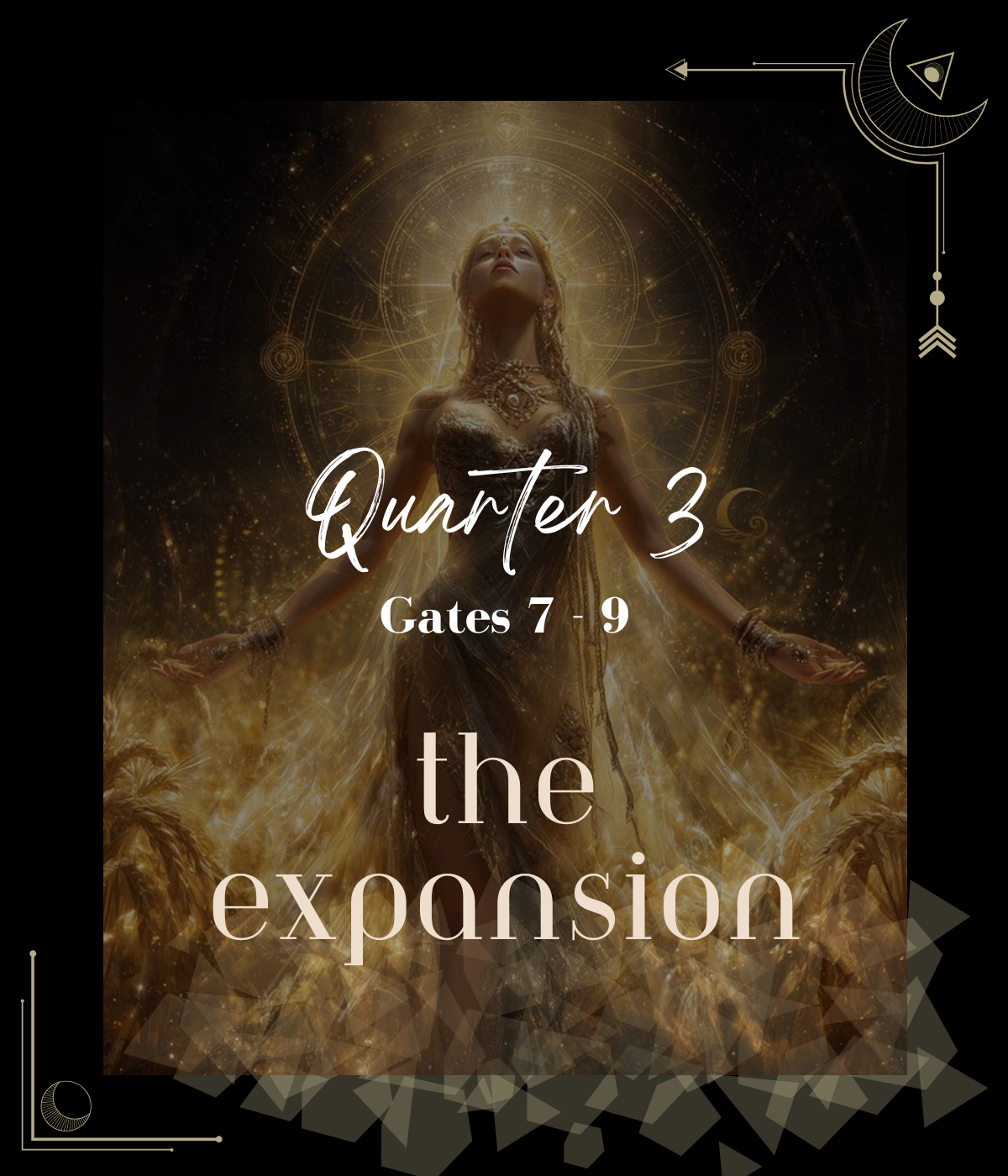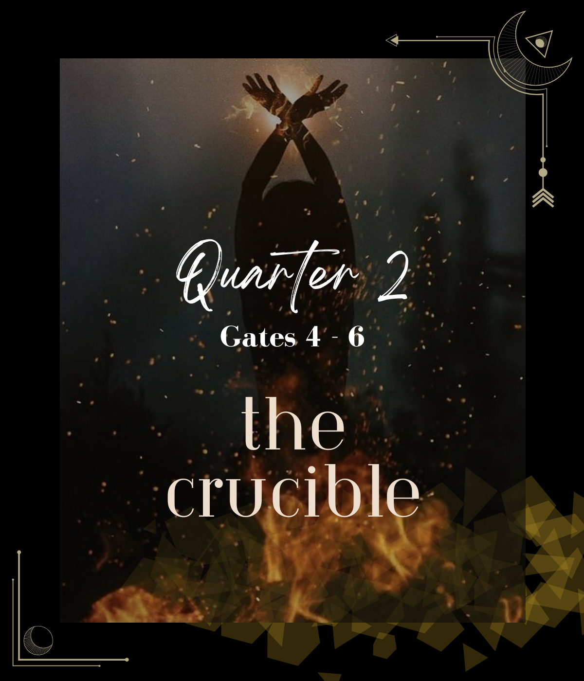You've survived the fire. Now you learn to wield it. This quarter teaches conscious alchemy - transmuting everything you've been through into wisdom and power. You'll work with archetypal forces, learn to stay true when old patterns seduce you back, and engage in deep erotic reclamation work. You will take back your voice, your body, your pleasure, your birthright. This is where your capacity expands. This is where you learn to lead yourself. Everything and anything still in the way will burn as you walk through The Gate of Awakening, The Fire of Alchemy, and the 9th gate - Temptation and Dissolution. These 3 will test you, to see if you will truly choose the woman you are proclaiming to be. The woman your soul knows you to be.