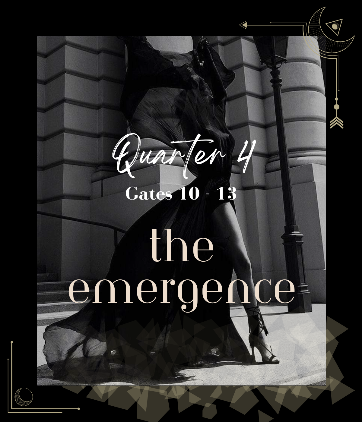 The final stretch. This quarter integrates everything, where your mindset, beliefs and nervous system catch up to the new identity you've been cultivating. You will cross through The Gate of Reclamation - reclaiming the fullest and wildest expression of you, stepping beyond the threshold into your own becoming. Gate 11, Power to Purpose, claiming what is yours in the world and embodying the power to achieve it through true feminine leadership. Then comes The Rebirth, where you finally get to access the Wild Aliveness that has lived within you all along. And finally, The Emergence, our 13th and final gate, and final retreat.